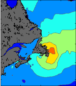 Data is used from WebTide, along with T-Tide, to predict the tidal elevations on a two-dimensional grid of the northwest Atlantic (see figure below). By adding the storm surge levels(DalCoast), we are able to predict the total sea level. The movies on the left show the two day forecast of the predicted tides, storm surge levels, and total sea levels for the northwest Atlantic region.